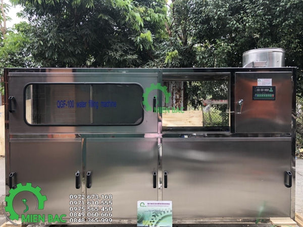 Dây chuyền chiết rót và đóng nắp bình 20L tự động 3 trong 1 (QGF 100) do CÔNG TY TNHH CHẾ TẠO VÀ CHUYỂN GIAO CÔNG NGHỆ MIỀN BẮC cung cấp là một trong những thiết bị chuyên dụng, được dùng để chiết rót đóng bình nước uống tinh khiết tự động. Sản phẩm được sản xuất theo công nghệ chiết rót hiện đại nhất. Với 3 công đoạn tự động sục rửa bình, chiết rót bình và xoáy nắp bình tự động (loại không có ren). Với 3 công đoạn này các doanh nghiệp sẽ tiết kiệm được rất nhiều chi phí sản xuất mà năng suất lại tăng gấp nhiều lần so với các loại máy chiết thông thường. Dây chuyền hoạt động với công suất 100 bình 20 lít/giờ.