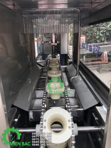 Những vỏ bình đã được rút nắp sẽ được nhân công đưa tới bộ phận giữ bình trong công đoạn tráng rửa bình tự động của máy chiết bình QGF100. Vỏ bình sẽ được cố định và dịch chuyển nhờ xích tải bình dưới tác dụng của motor băng tải hoạt động.