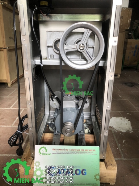 - Máy thái thịt,có hệ thống bánh răng giản tốc giúp cho máy thái thịt khỏe hơn.và động cơ chạy bằng dây curoa để chuyền tải dây curoa lên bánh răng cùng lưỡi dao.